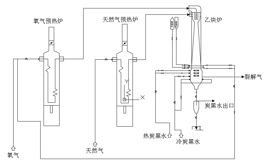 在反應(yīng)室中,天然氣和氧氣經(jīng)過最佳反應(yīng)時(shí)間后,離開反應(yīng)室。為了防止已經(jīng)生成的乙炔發(fā)生深度裂解,成為碳黑和氫,必須立即對(duì)裂解氣進(jìn)行淬火降溫。淬火時(shí)裂化氣大約冷卻到87℃,淬火水被加熱到84℃。反應(yīng)室的側(cè)壁用冷凝液進(jìn)行冷卻,在反應(yīng)過程中,反應(yīng)室的冷卻壁和燒嘴板底部會(huì)結(jié)焦,必須每隔一段時(shí)間通過手動(dòng)機(jī)件敲打清除硬質(zhì)碳黑。