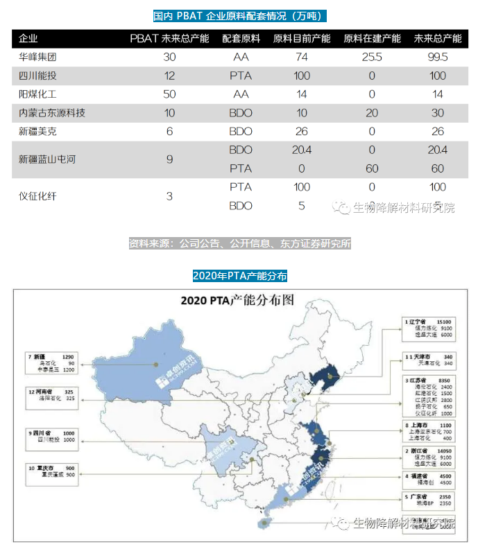 PBAT所用的三種原料 PTA 和己二酸產(chǎn)能主要都集中在中東部,BDO 主要集中在西部。